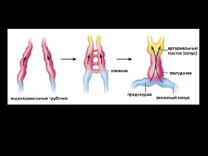 • Часть артериальных дуг редуцируется, из других образуются крупные артерии головы, шеи и грудной клетки • Дорзальные аорты сливаются в одну нисходящую аорту (3 неделя развития)