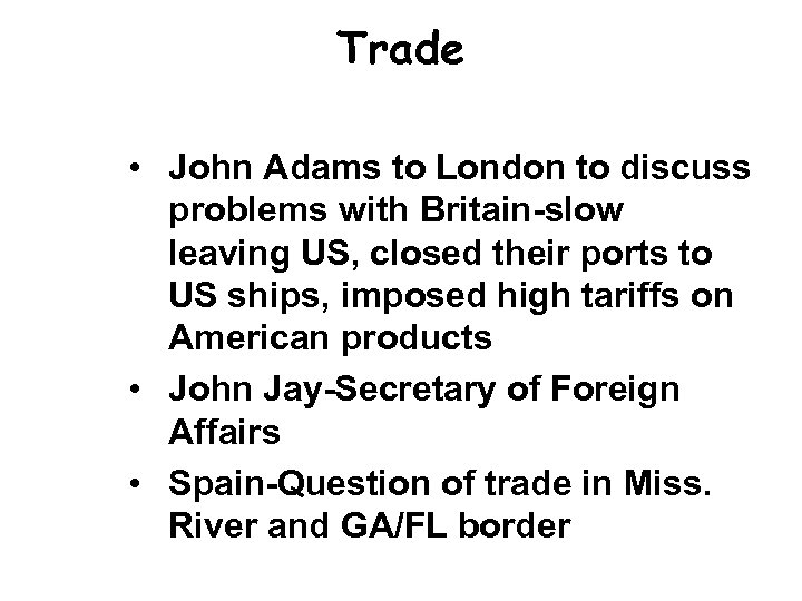 Trade • John Adams to London to discuss problems with Britain-slow leaving US, closed their ports to US ships, imposed high tariffs on American products • John Jay-Secretary of Foreign Affairs • Spain-Question of trade in Miss. River and GA/FL border