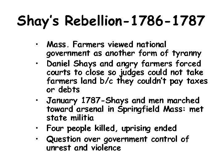 Shay’s Rebellion-1786 -1787 • Mass. Farmers viewed national government as another form of tyranny • Daniel Shays and angry farmers forced courts to close so judges could not take farmers land b/c they couldn’t pay taxes or debts • January 1787 -Shays and men marched toward arsenal in Springfield Mass: met state militia • Four people killed, uprising ended • Question over government control of unrest and violence