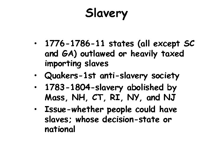 Slavery • 1776 -1786 -11 states (all except SC and GA) outlawed or heavily taxed importing slaves • Quakers-1 st anti-slavery society • 1783 -1804 -slavery abolished by Mass, NH, CT, RI, NY, and NJ • Issue-whether people could have slaves; whose decision-state or national