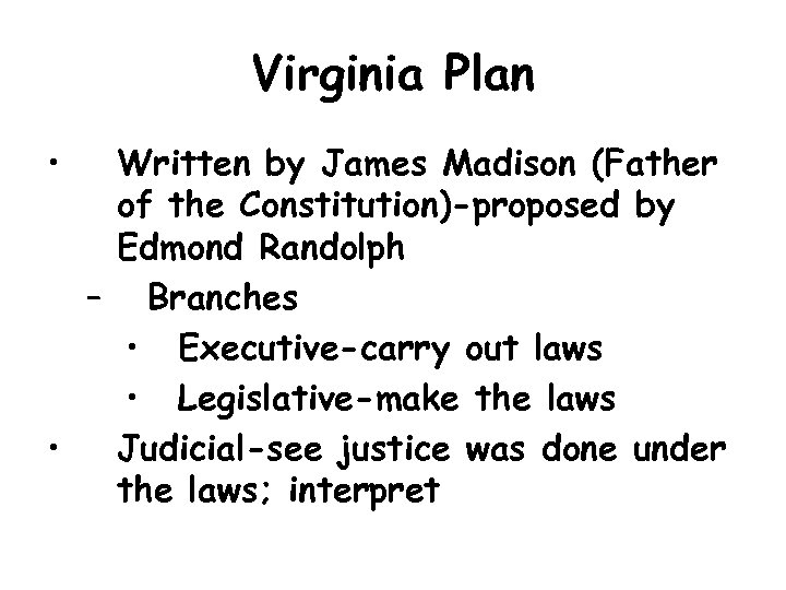 Virginia Plan • Written by James Madison (Father of the Constitution)-proposed by Edmond Randolph – Branches • Executive-carry out laws • Legislative-make the laws • Judicial-see justice was done under the laws; interpret