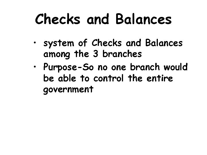 Checks and Balances • system of Checks and Balances among the 3 branches • Purpose-So no one branch would be able to control the entire government