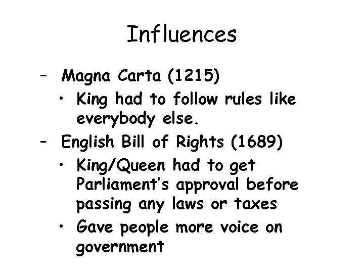 Influences – Magna Carta (1215) • King had to follow rules like everybody else. – English Bill of Rights (1689) • King/Queen had to get Parliament’s approval before passing any laws or taxes • Gave people more voice on government