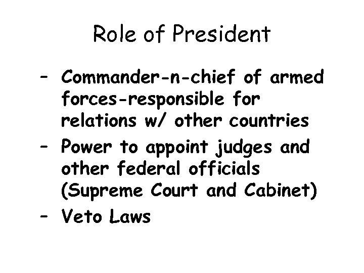 Role of President – Commander-n-chief of armed forces-responsible for relations w/ other countries – Power to appoint judges and other federal officials (Supreme Court and Cabinet) – Veto Laws