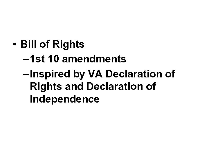 • Bill of Rights – 1 st 10 amendments – Inspired by VA Declaration of Rights and Declaration of Independence