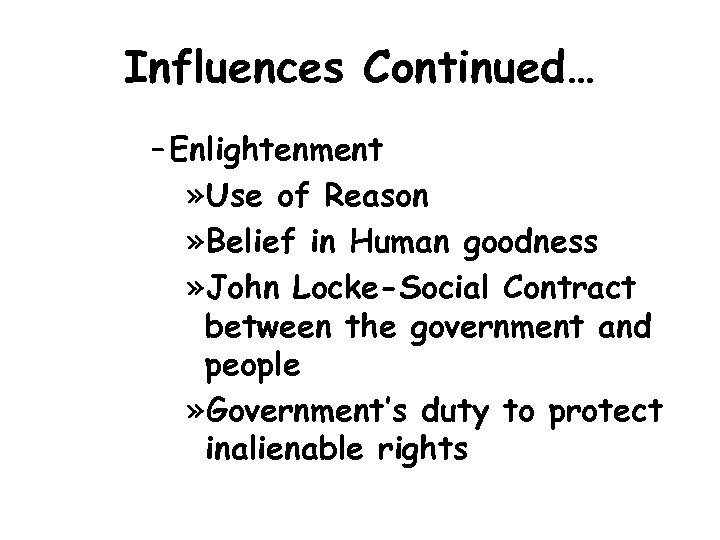 Influences Continued… – Enlightenment » Use of Reason » Belief in Human goodness » John Locke-Social Contract between the government and people » Government’s duty to protect inalienable rights