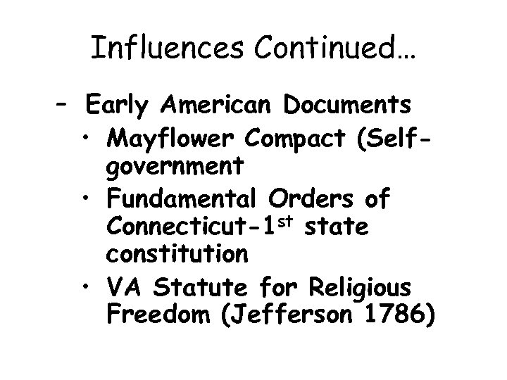 Influences Continued… – Early American Documents • Mayflower Compact (Selfgovernment • Fundamental Orders of Connecticut-1 st state constitution • VA Statute for Religious Freedom (Jefferson 1786)