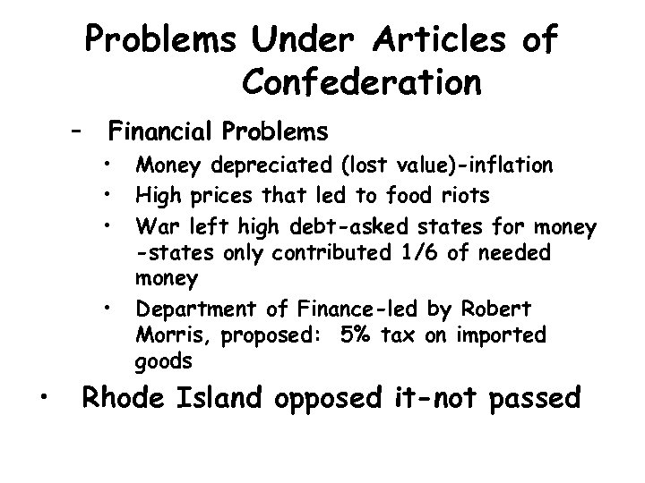 Problems Under Articles of Confederation – Financial Problems • • • Money depreciated (lost value)-inflation High prices that led to food riots War left high debt-asked states for money -states only contributed 1/6 of needed money Department of Finance-led by Robert Morris, proposed: 5% tax on imported goods Rhode Island opposed it-not passed