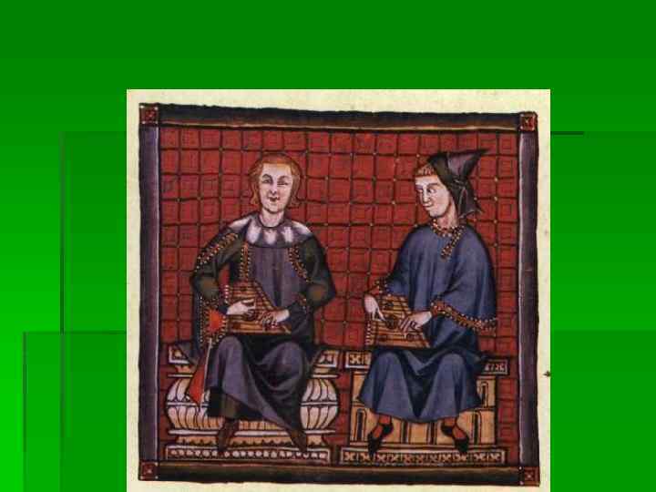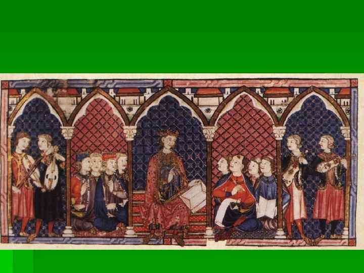 Миннезингеры § Под сильным воздействием поэзии романских трубадуров и труверов складывается куртуазная лирика миннезингеров (нем. Minnesinger — певец любви) - немецких рыцарских поэтовпевцов XII-XIV вв. § Основные жанры, в которых творили немецкие миннезингеры, это любовная песнь (Minnelied), песнь рассвета (Tagelied), лейх (Leich), шпрух (Spruch).