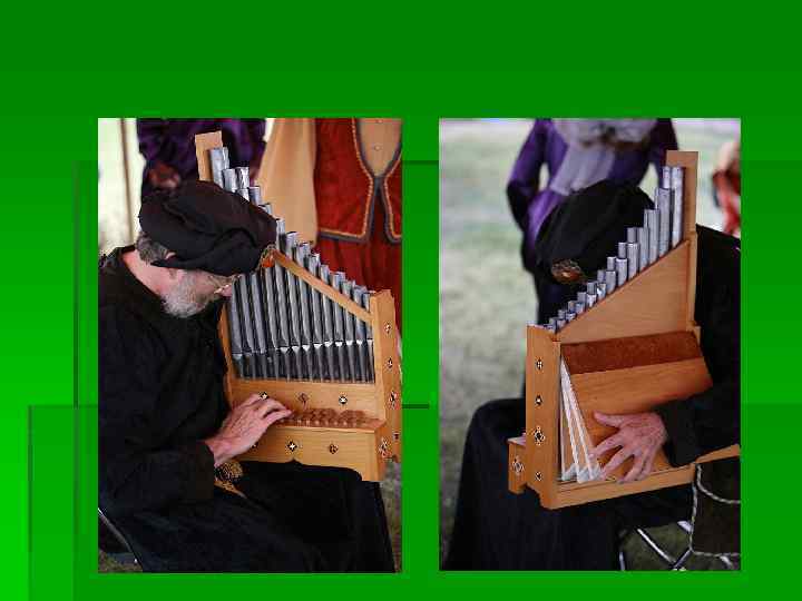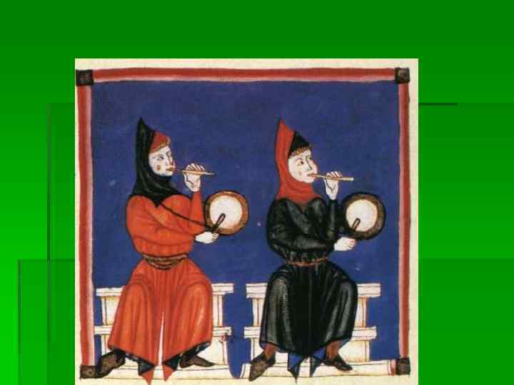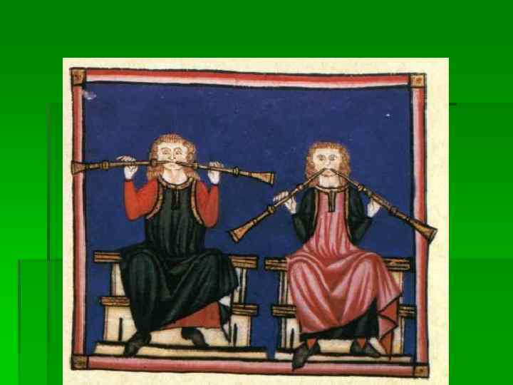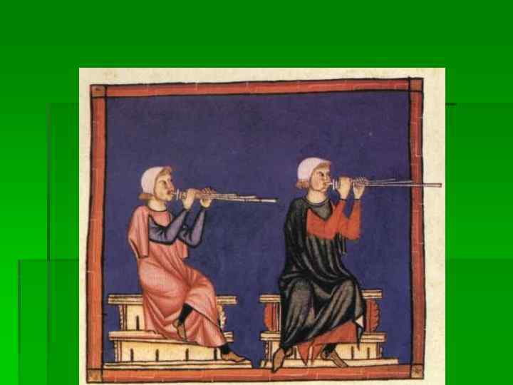 Духовые инструменты § § Флейта. Двойная флейта Шалмей (с двойной тростью), корнамуз Бомбарда - ближайший предок фагота Цинк – с 11 в. (рожок) – духовой мундштучный инструмент, 7 (6 + 1) отверстий, обтягивали кожей (позднее в Италии – корнет) § Сакбут - медный мундштучный инструмент, напоминающий по своей форме тромбон