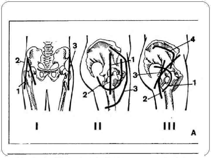 Боковой способ Лангенбека — Кенига. В положении на здоровом боку (больную ногу сгибают под углом 45°) проводят разрез до кости от середины расстояния между передневерхней остью подвздошной кости и большим вертелом, затем вниз через верхушку вертела и вдоль верхней трети бедра.