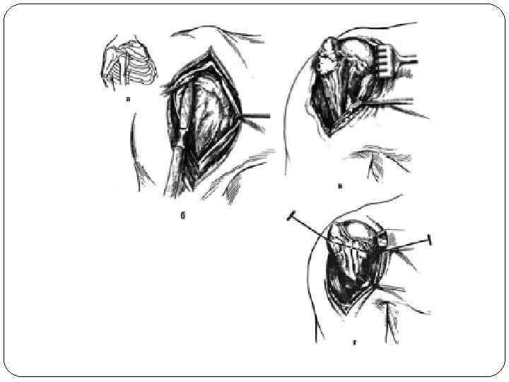 Задний способ Кохера. Разрез начинается от ключично- акромиального сочленения вдоль верхнего края sp. scapulae до ее середины, затем загибается дугообразно книзу, к подмышечной впадине, заканчиваясь на расстоянии двух пальцев от заднего края ее; вскрывается ключично-акромиальное сочленение, рассекается вдоль верхнего края sp. scapulae прикрепление m. cucullaris и предлежащая часть m. deltoidei, к-рые тупо выделяются от подлежащих мышц. Proc. acrom. отсекается косо в направлении шейки лопатки и вместе с m. deltoid, оттягивается кпереди через головку плеча, обнажая задне-боковую поверхность плечевого сустава и головки, покрытой сухожилиями мышц, поворачивающих плечо кнаружи (mm. suprasp. , infrasp. , teres min. ). Из sulc. intertuberc. отсекается сначала tub. major, затем tub. minor, которые оттягиваются кзади и кпереди вместе с мышцами, после чего головка может быть вывихнута кзади.