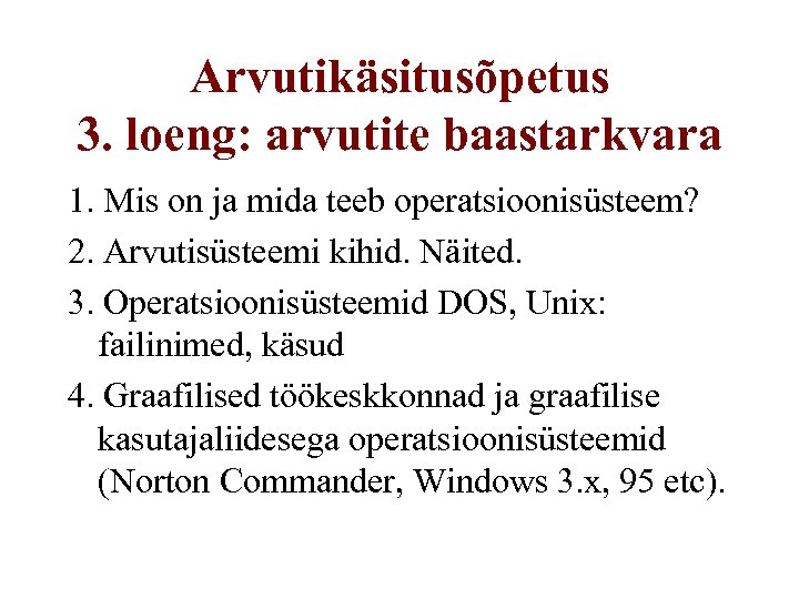 Arvutikäsitusõpetus 3. loeng: arvutite baastarkvara 1. Mis on ja mida teeb operatsioonisüsteem? 2. Arvutisüsteemi kihid. Näited. 3. Operatsioonisüsteemid DOS, Unix: failinimed, käsud 4. Graafilised töökeskkonnad ja graafilise kasutajaliidesega operatsioonisüsteemid (Norton Commander, Windows 3. x, 95 etc).
