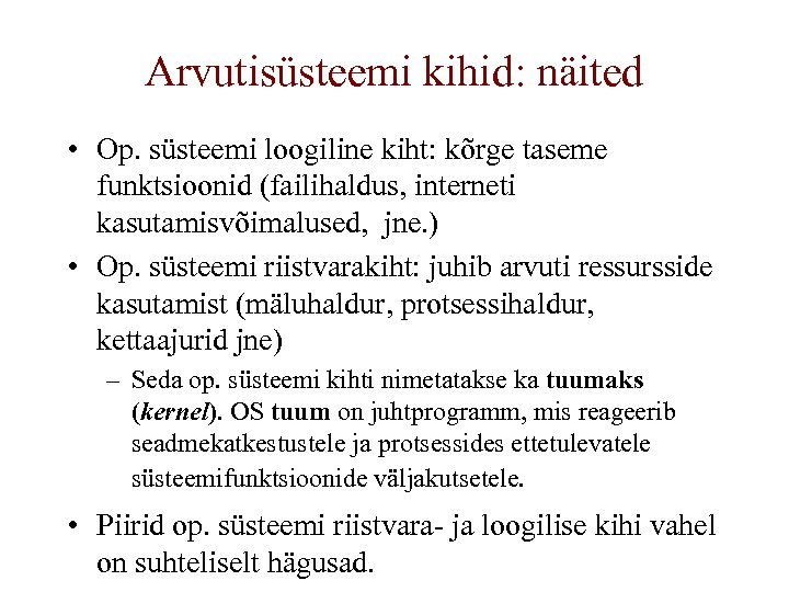 Arvutisüsteemi kihid: näited • Op. süsteemi loogiline kiht: kõrge taseme funktsioonid (failihaldus, interneti kasutamisvõimalused, jne. ) • Op. süsteemi riistvarakiht: juhib arvuti ressursside kasutamist (mäluhaldur, protsessihaldur, kettaajurid jne) – Seda op. süsteemi kihti nimetatakse ka tuumaks (kernel). OS tuum on juhtprogramm, mis reageerib seadmekatkestustele ja protsessides ettetulevatele süsteemifunktsioonide väljakutsetele. • Piirid op. süsteemi riistvara- ja loogilise kihi vahel on suhteliselt hägusad.