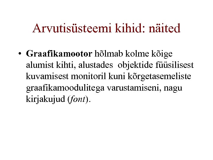 Arvutisüsteemi kihid: näited • Graafikamootor hõlmab kolme kõige alumist kihti, alustades objektide füüsilisest kuvamisest monitoril kuni kõrgetasemeliste graafikamoodulitega varustamiseni, nagu kirjakujud (font).