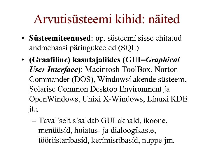 Arvutisüsteemi kihid: näited • Süsteemiteenused: op. süsteemi sisse ehitatud andmebaasi päringukeeled (SQL) • (Graafiline) kasutajaliides (GUI=Graphical User Interface): Macintosh Tool. Box, Norton Commander (DOS), Windowsi akende süsteem, Solarise Common Desktop Environment ja Open. Windows, Unixi X-Windows, Linuxi KDE jt. ; – Tavaliselt sisaldab GUI aknaid, ikoone, menüüsid, hoiatus- ja dialoogikaste, tööriistaribasid, kerimisribasid, nuppe jm.