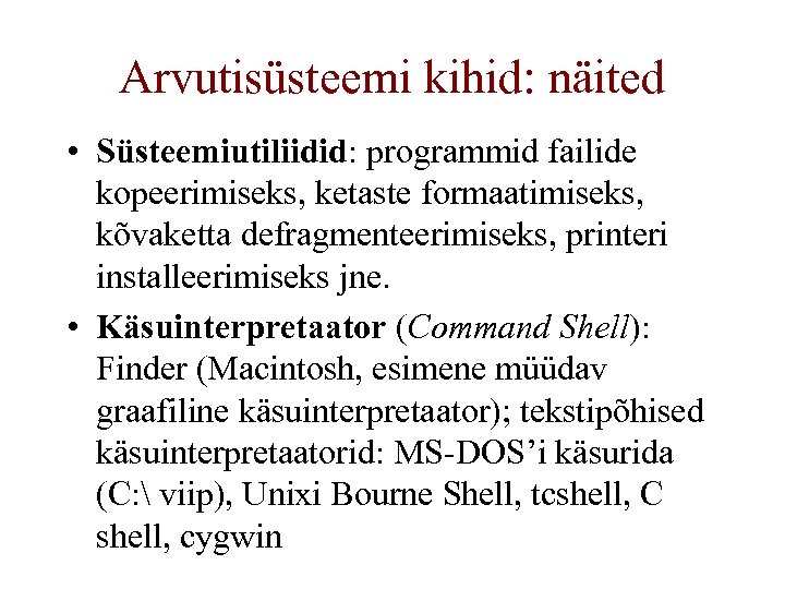 Arvutisüsteemi kihid: näited • Süsteemiutiliidid: programmid failide kopeerimiseks, ketaste formaatimiseks, kõvaketta defragmenteerimiseks, printeri installeerimiseks jne. • Käsuinterpretaator (Command Shell): Finder (Macintosh, esimene müüdav graafiline käsuinterpretaator); tekstipõhised käsuinterpretaatorid: MS-DOS’i käsurida (C: viip), Unixi Bourne Shell, tcshell, C shell, cygwin