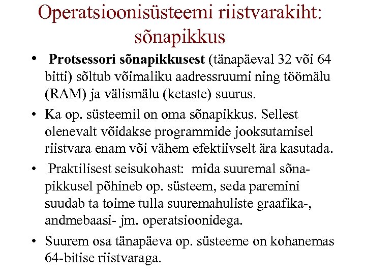 Operatsioonisüsteemi riistvarakiht: sõnapikkus • Protsessori sõnapikkusest (tänapäeval 32 või 64 bitti) sõltub võimaliku aadressruumi ning töömälu (RAM) ja välismälu (ketaste) suurus. • Ka op. süsteemil on oma sõnapikkus. Sellest olenevalt võidakse programmide jooksutamisel riistvara enam või vähem efektiivselt ära kasutada. • Praktilisest seisukohast: mida suuremal sõnapikkusel põhineb op. süsteem, seda paremini suudab ta toime tulla suuremahuliste graafika-, andmebaasi- jm. operatsioonidega. • Suurem osa tänapäeva op. süsteeme on kohanemas 64 -bitise riistvaraga.