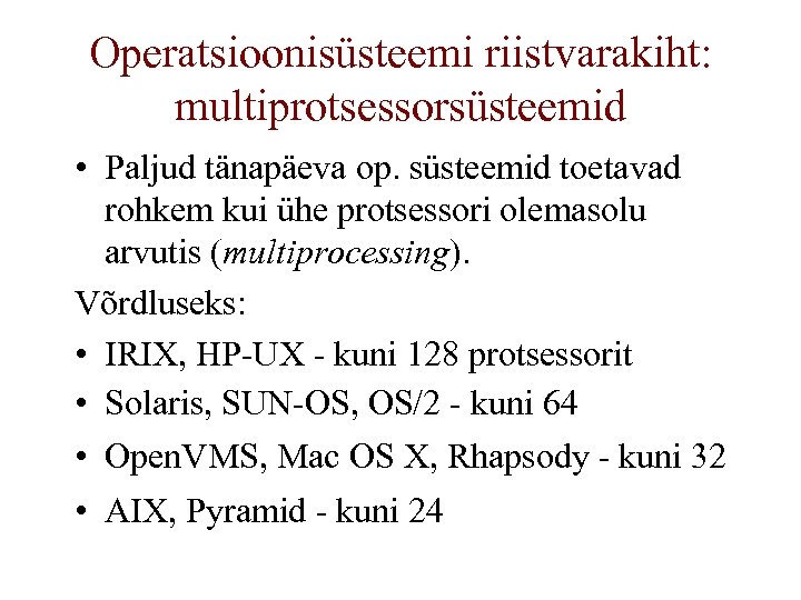 Operatsioonisüsteemi riistvarakiht: multiprotsessorsüsteemid • Paljud tänapäeva op. süsteemid toetavad rohkem kui ühe protsessori olemasolu arvutis (multiprocessing). Võrdluseks: • IRIX, HP-UX - kuni 128 protsessorit • Solaris, SUN-OS, OS/2 - kuni 64 • Open. VMS, Mac OS X, Rhapsody - kuni 32 • AIX, Pyramid - kuni 24