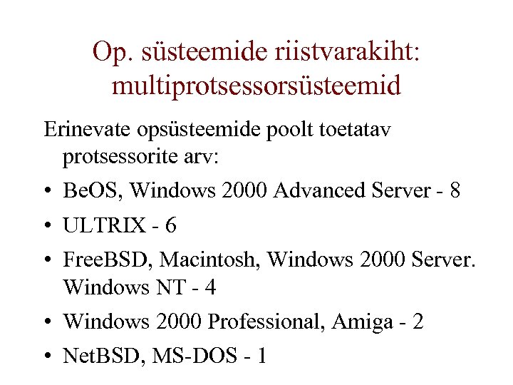 Op. süsteemide riistvarakiht: multiprotsessorsüsteemid Erinevate opsüsteemide poolt toetatav protsessorite arv: • Be. OS, Windows 2000 Advanced Server - 8 • ULTRIX - 6 • Free. BSD, Macintosh, Windows 2000 Server. Windows NT - 4 • Windows 2000 Professional, Amiga - 2 • Net. BSD, MS-DOS - 1