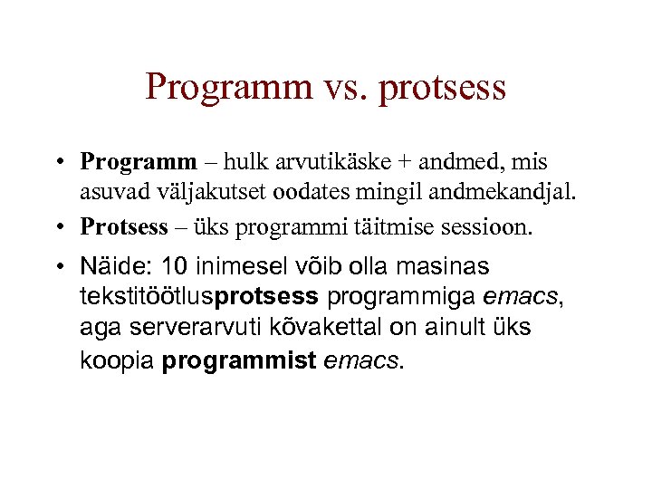 Programm vs. protsess • Programm – hulk arvutikäske + andmed, mis asuvad väljakutset oodates mingil andmekandjal. • Protsess – üks programmi täitmise sessioon. • Näide: 10 inimesel võib olla masinas tekstitöötlusprotsess programmiga emacs, aga serverarvuti kõvakettal on ainult üks koopia programmist emacs.