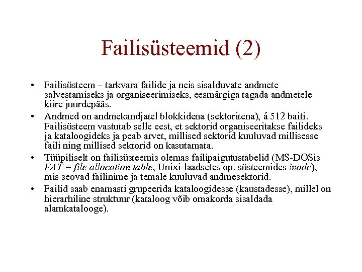Failisüsteemid (2) • Failisüsteem – tarkvara failide ja neis sisalduvate andmete salvestamiseks ja organiseerimiseks, eesmärgiga tagada andmetele kiire juurdepääs. • Andmed on andmekandjatel blokkidena (sektoritena), á 512 baiti. Failisüsteem vastutab selle eest, et sektorid organiseeritakse failideks ja kataloogideks ja peab arvet, millised sektorid kuuluvad millisesse faili ning millised sektorid on kasutamata. • Tüüpiliselt on failisüsteemis olemas failipaigutustabelid (MS-DOSis FAT = file allocation table, Unixi-laadsetes op. süsteemides inode), mis seovad failinime ja temale kuuluvad andmesektorid. • Failid saab enamasti grupeerida kataloogidesse (kaustadesse), millel on hierarhiline struktuur (kataloog võib omakorda sisaldada alamkatalooge).