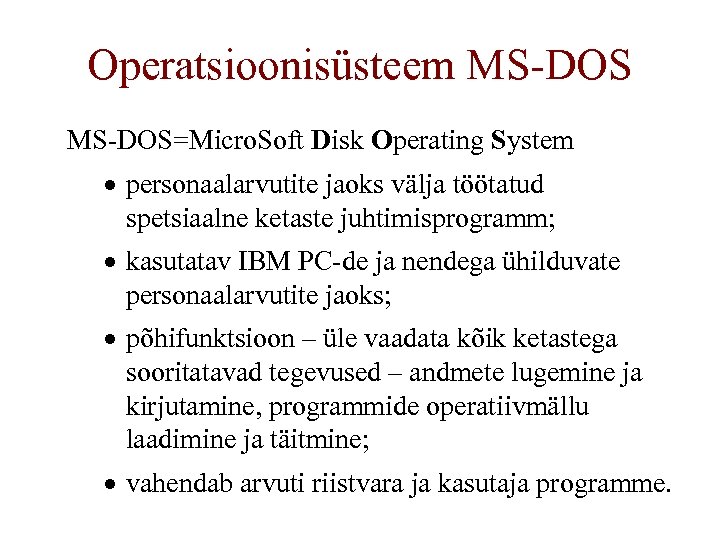 Operatsioonisüsteem MS-DOS=Micro. Soft Disk Operating System · personaalarvutite jaoks välja töötatud spetsiaalne ketaste juhtimisprogramm; · kasutatav IBM PC-de ja nendega ühilduvate personaalarvutite jaoks; · põhifunktsioon – üle vaadata kõik ketastega sooritatavad tegevused – andmete lugemine ja kirjutamine, programmide operatiivmällu laadimine ja täitmine; · vahendab arvuti riistvara ja kasutaja programme.