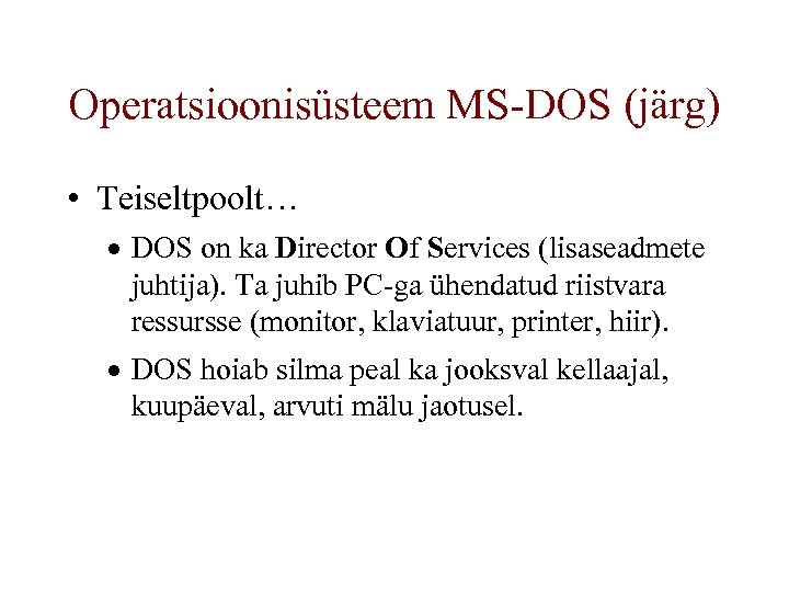 Operatsioonisüsteem MS-DOS (järg) • Teiseltpoolt… · DOS on ka Director Of Services (lisaseadmete juhtija). Ta juhib PC-ga ühendatud riistvara ressursse (monitor, klaviatuur, printer, hiir). · DOS hoiab silma peal ka jooksval kellaajal, kuupäeval, arvuti mälu jaotusel.