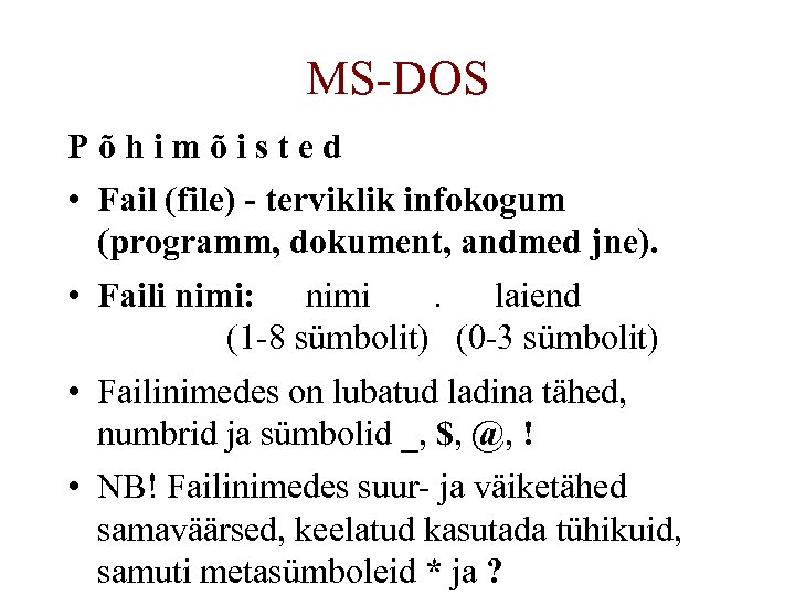 MS-DOS Põhimõisted • Fail (file) - terviklik infokogum (programm, dokument, andmed jne). • Faili nimi: nimi. laiend (1 -8 sümbolit) (0 -3 sümbolit) • Failinimedes on lubatud ladina tähed, numbrid ja sümbolid _, $, @, ! • NB! Failinimedes suur- ja väiketähed samaväärsed, keelatud kasutada tühikuid, samuti metasümboleid * ja ?