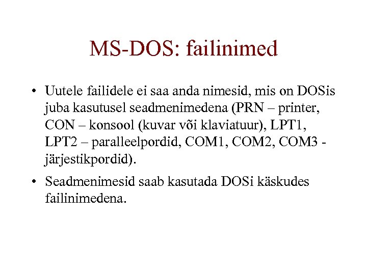 MS-DOS: failinimed • Uutele failidele ei saa anda nimesid, mis on DOSis juba kasutusel seadmenimedena (PRN – printer, CON – konsool (kuvar või klaviatuur), LPT 1, LPT 2 – paralleelpordid, COM 1, COM 2, COM 3 järjestikpordid). • Seadmenimesid saab kasutada DOSi käskudes failinimedena.