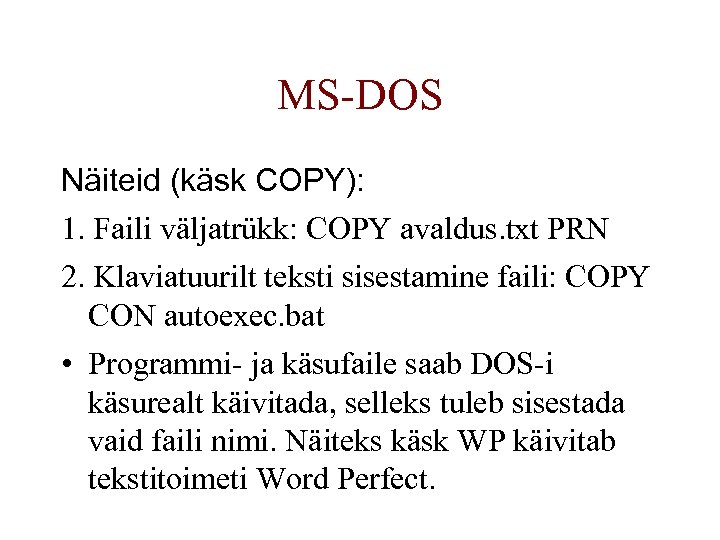 MS-DOS Näiteid (käsk COPY): 1. Faili väljatrükk: COPY avaldus. txt PRN 2. Klaviatuurilt teksti sisestamine faili: COPY CON autoexec. bat • Programmi- ja käsufaile saab DOS-i käsurealt käivitada, selleks tuleb sisestada vaid faili nimi. Näiteks käsk WP käivitab tekstitoimeti Word Perfect.