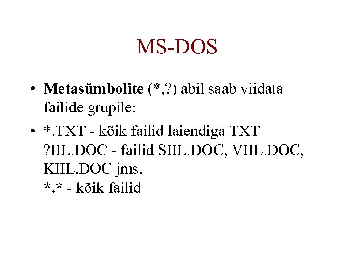 MS-DOS • Metasümbolite (*, ? ) abil saab viidata failide grupile: • *. TXT - kõik failid laiendiga TXT ? IIL. DOC - failid SIIL. DOC, VIIL. DOC, KIIL. DOC jms. *. * - kõik failid