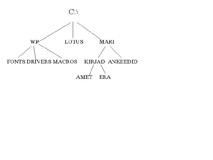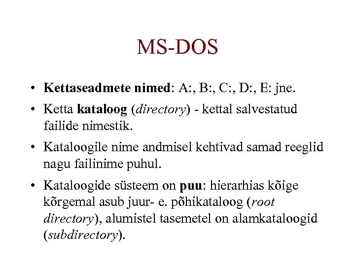 MS-DOS • Kettaseadmete nimed: A: , B: , C: , D: , E: jne. • Ketta kataloog (directory) - kettal salvestatud failide nimestik. • Kataloogile nime andmisel kehtivad samad reeglid nagu failinime puhul. • Kataloogide süsteem on puu: hierarhias kõige kõrgemal asub juur- e. põhikataloog (root directory), alumistel tasemetel on alamkataloogid (subdirectory).
