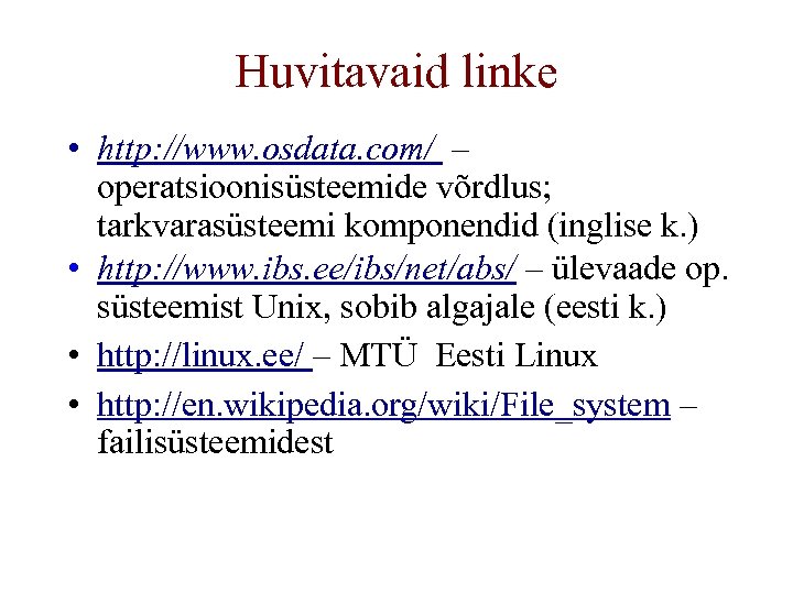 Huvitavaid linke • http: //www. osdata. com/ – operatsioonisüsteemide võrdlus; tarkvarasüsteemi komponendid (inglise k. ) • http: //www. ibs. ee/ibs/net/abs/ – ülevaade op. süsteemist Unix, sobib algajale (eesti k. ) • http: //linux. ee/ – MTÜ Eesti Linux • http: //en. wikipedia. org/wiki/File_system – failisüsteemidest