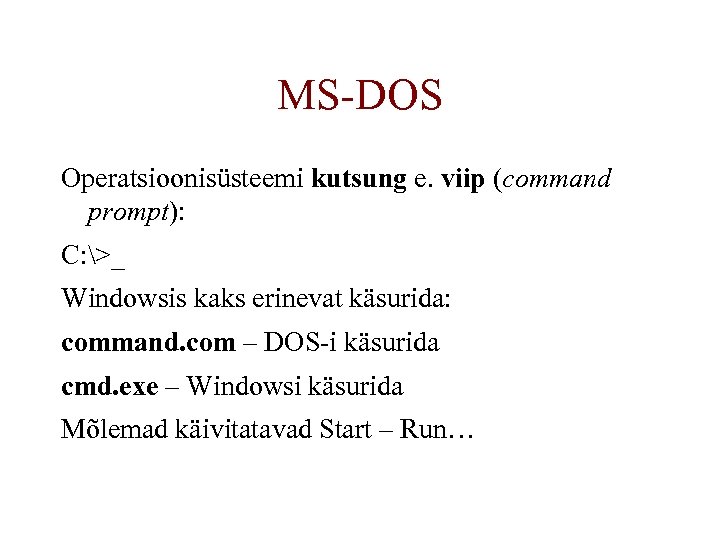 MS-DOS Operatsioonisüsteemi kutsung e. viip (command prompt): C: >_ Windowsis kaks erinevat käsurida: command. com – DOS-i käsurida cmd. exe – Windowsi käsurida Mõlemad käivitatavad Start – Run…