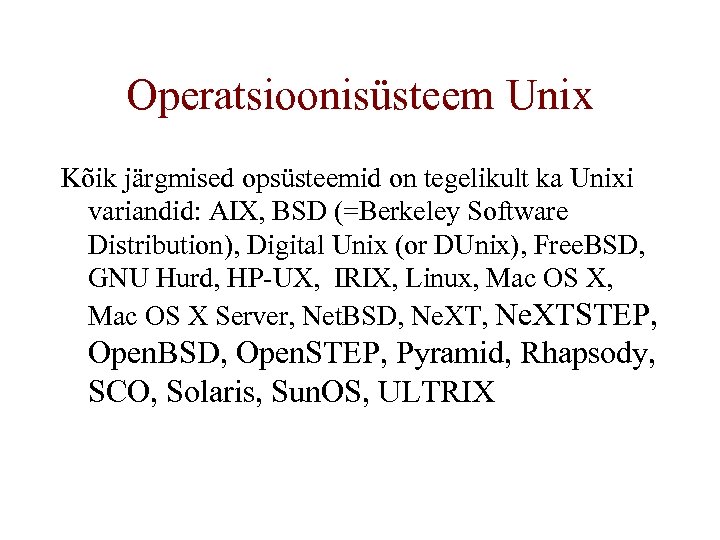 Operatsioonisüsteem Unix Kõik järgmised opsüsteemid on tegelikult ka Unixi variandid: AIX, BSD (=Berkeley Software Distribution), Digital Unix (or DUnix), Free. BSD, GNU Hurd, HP-UX, IRIX, Linux, Mac OS X Server, Net. BSD, Ne. XTSTEP, Open. BSD, Open. STEP, Pyramid, Rhapsody, SCO, Solaris, Sun. OS, ULTRIX