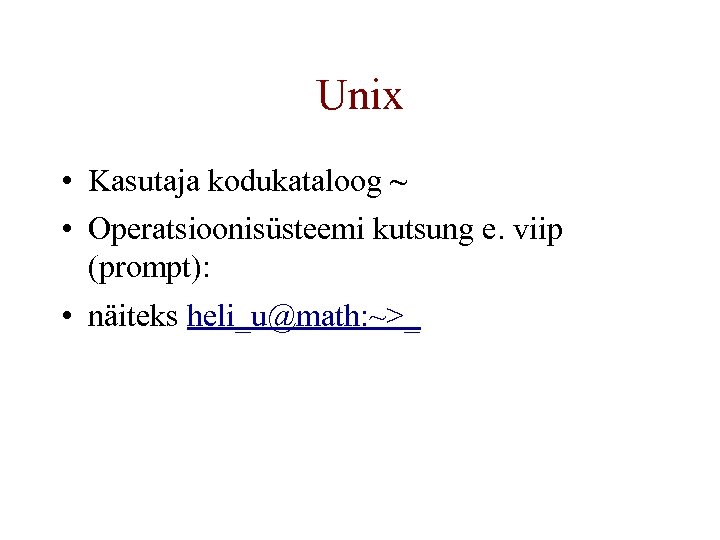 Unix • Kasutaja kodukataloog ~ • Operatsioonisüsteemi kutsung e. viip (prompt): • näiteks heli_u@math: ~>_