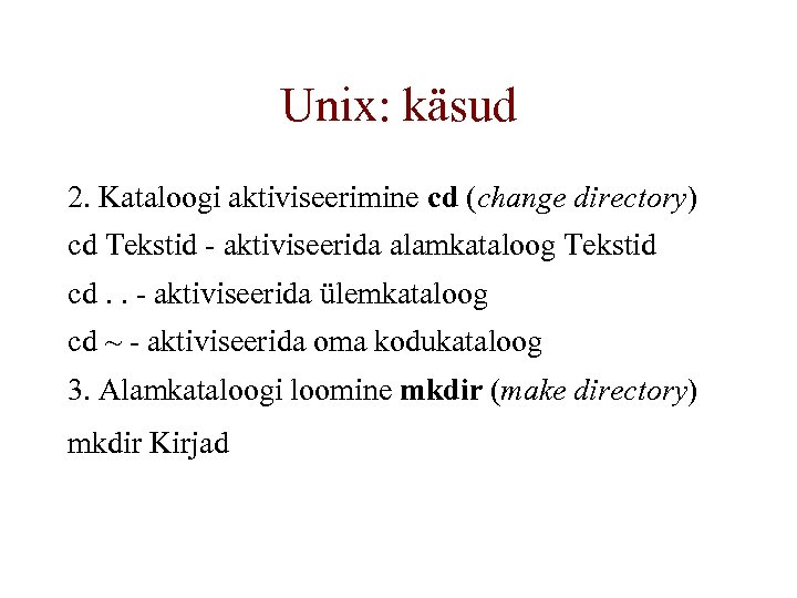 Unix: käsud 2. Kataloogi aktiviseerimine cd (change directory) cd Tekstid - aktiviseerida alamkataloog Tekstid cd. . - aktiviseerida ülemkataloog cd ~ - aktiviseerida oma kodukataloog 3. Alamkataloogi loomine mkdir (make directory) mkdir Kirjad