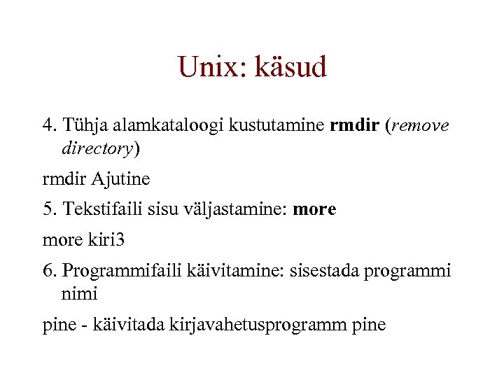 Unix: käsud 4. Tühja alamkataloogi kustutamine rmdir (remove directory) rmdir Ajutine 5. Tekstifaili sisu väljastamine: more kiri 3 6. Programmifaili käivitamine: sisestada programmi nimi pine - käivitada kirjavahetusprogramm pine