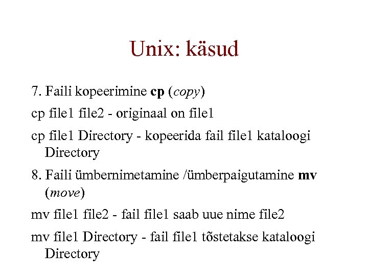 Unix: käsud 7. Faili kopeerimine cp (copy) cp file 1 file 2 - originaal on file 1 cp file 1 Directory - kopeerida fail file 1 kataloogi Directory 8. Faili ümbernimetamine /ümberpaigutamine mv (move) mv file 1 file 2 - fail file 1 saab uue nime file 2 mv file 1 Directory - fail file 1 tõstetakse kataloogi Directory