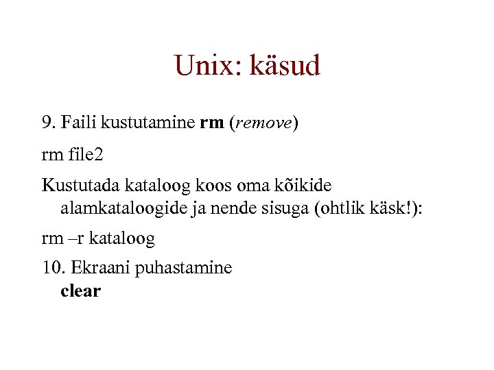 Unix: käsud 9. Faili kustutamine rm (remove) rm file 2 Kustutada kataloog koos oma kõikide alamkataloogide ja nende sisuga (ohtlik käsk!): rm –r kataloog 10. Ekraani puhastamine clear
