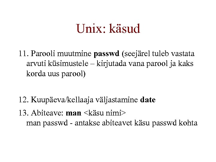 Unix: käsud 11. Parooli muutmine passwd (seejärel tuleb vastata arvuti küsimustele – kirjutada vana parool ja kaks korda uus parool) 12. Kuupäeva/kellaaja väljastamine date 13. Abiteave: man <käsu nimi> man passwd - antakse abiteavet käsu passwd kohta