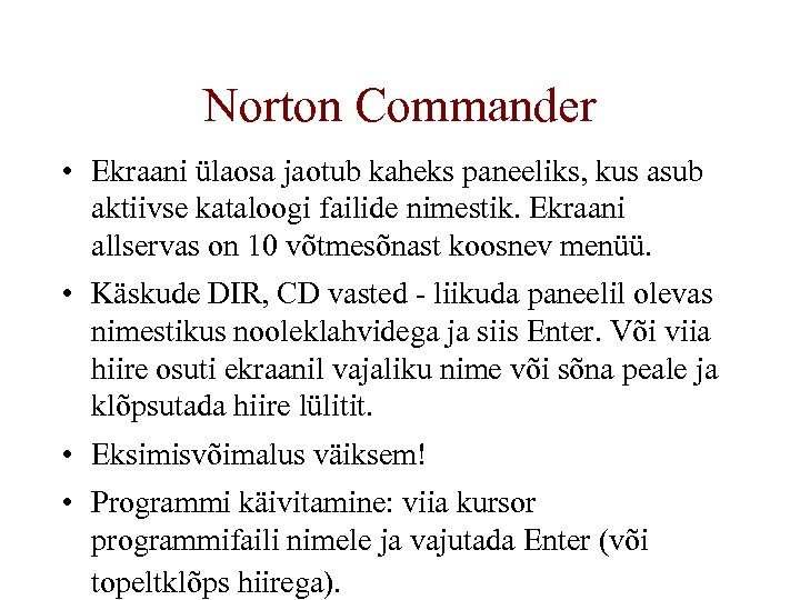Norton Commander • Ekraani ülaosa jaotub kaheks paneeliks, kus asub aktiivse kataloogi failide nimestik. Ekraani allservas on 10 võtmesõnast koosnev menüü. • Käskude DIR, CD vasted - liikuda paneelil olevas nimestikus nooleklahvidega ja siis Enter. Või viia hiire osuti ekraanil vajaliku nime või sõna peale ja klõpsutada hiire lülitit. • Eksimisvõimalus väiksem! • Programmi käivitamine: viia kursor programmifaili nimele ja vajutada Enter (või topeltklõps hiirega).