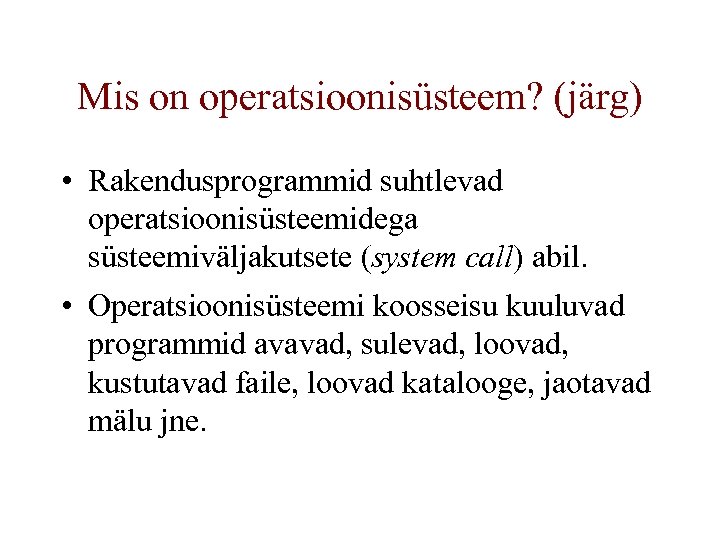 Mis on operatsioonisüsteem? (järg) • Rakendusprogrammid suhtlevad operatsioonisüsteemidega süsteemiväljakutsete (system call) abil. • Operatsioonisüsteemi koosseisu kuuluvad programmid avavad, sulevad, loovad, kustutavad faile, loovad katalooge, jaotavad mälu jne.