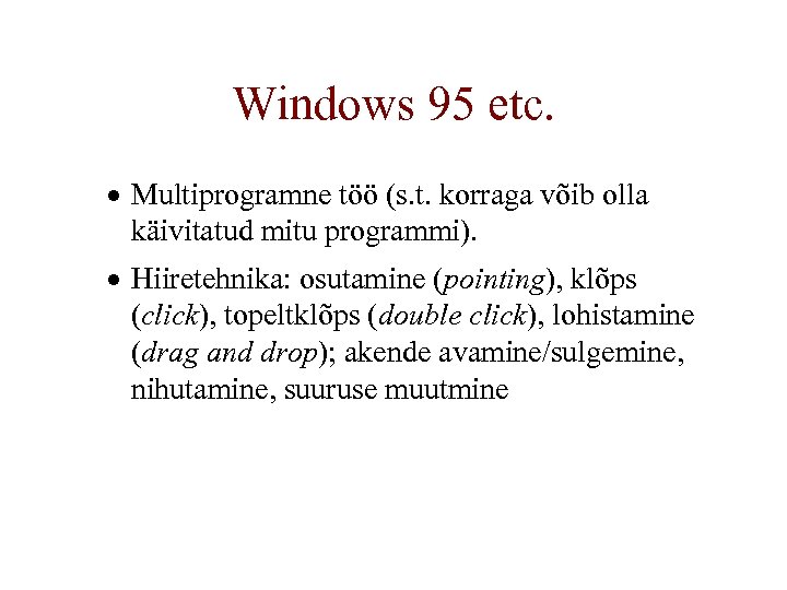Windows 95 etc. · Multiprogramne töö (s. t. korraga võib olla käivitatud mitu programmi). · Hiiretehnika: osutamine (pointing), klõps (click), topeltklõps (double click), lohistamine (drag and drop); akende avamine/sulgemine, nihutamine, suuruse muutmine