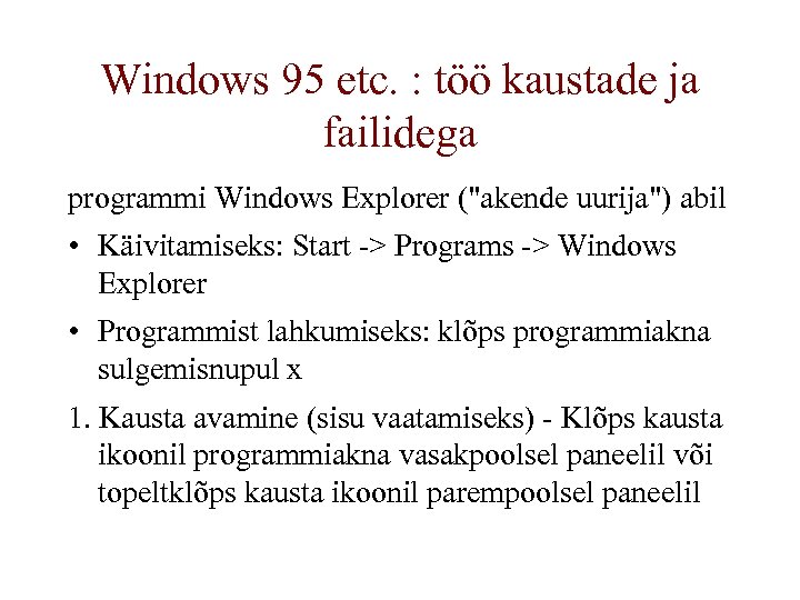 Windows 95 etc. : töö kaustade ja failidega programmi Windows Explorer ("akende uurija") abil • Käivitamiseks: Start -> Programs -> Windows Explorer • Programmist lahkumiseks: klõps programmiakna sulgemisnupul x 1. Kausta avamine (sisu vaatamiseks) - Klõps kausta ikoonil programmiakna vasakpoolsel paneelil või topeltklõps kausta ikoonil parempoolsel paneelil