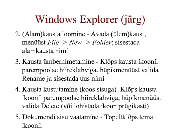 Windows Explorer (järg) 2. (Alam)kausta loomine - Avada (ülem)kaust, menüüst File -> New -> Folder; sisestada alamkausta nimi 3. Kausta ümbernimetamine - Klõps kausta ikoonil parempoolse hiireklahviga, hüpikmenüüst valida Rename ja sisestada uus nimi 4. Kausta kustutamine (koos sisuga) -Klõps kausta ikoonil parempoolse hiireklahviga, hüpikmenüüst valida Delete (või lohistada ikoon prügikasti) 5. Dokumendi sisu vaatamine - Topeltklõps tema ikoonil