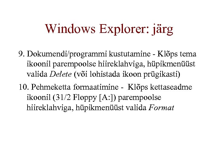 Windows Explorer: järg 9. Dokumendi/programmi kustutamine - Klõps tema ikoonil parempoolse hiireklahviga, hüpikmenüüst valida Delete (või lohistada ikoon prügikasti) 10. Pehmeketta formaatimine - Klõps kettaseadme ikoonil (31/2 Floppy [A: ]) parempoolse hiireklahviga, hüpikmenüüst valida Format