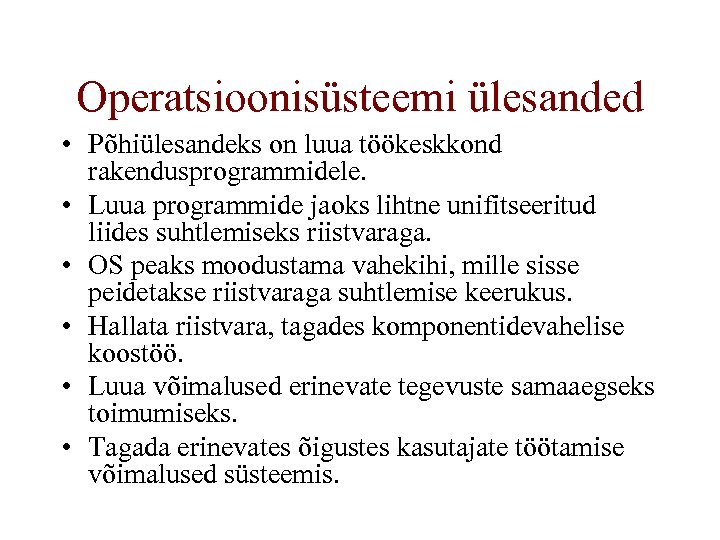 Operatsioonisüsteemi ülesanded • Põhiülesandeks on luua töökeskkond rakendusprogrammidele. • Luua programmide jaoks lihtne unifitseeritud liides suhtlemiseks riistvaraga. • OS peaks moodustama vahekihi, mille sisse peidetakse riistvaraga suhtlemise keerukus. • Hallata riistvara, tagades komponentidevahelise koostöö. • Luua võimalused erinevate tegevuste samaaegseks toimumiseks. • Tagada erinevates õigustes kasutajate töötamise võimalused süsteemis.