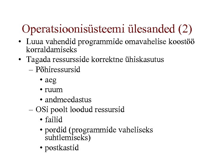 Operatsioonisüsteemi ülesanded (2) • Luua vahendid programmide omavahelise koostöö korraldamiseks • Tagada ressursside korrektne ühiskasutus – Põhiressursid • aeg • ruum • andmeedastus – OSi poolt loodud ressursid • failid • pordid (programmide vaheliseks suhtlemiseks) • postkastid